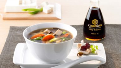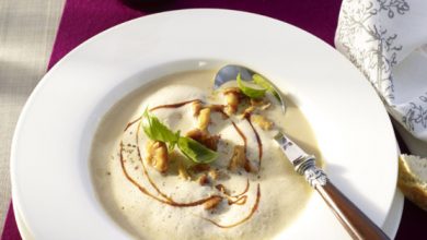 Soupe glacée de melon à la coriandre et topping de galettes au tofu à l’indienne