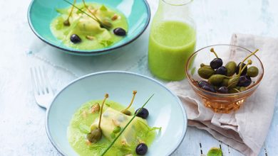 Raviole de Carré Frais® aux herbes, bouillon de tomate verte green zebra, olives violettes et câpres capucine