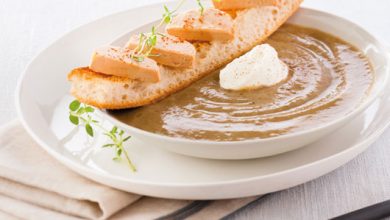 Soupe de lentilles, tartine de foie gras et crème à la muscade