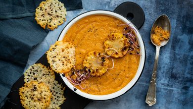 Velouté de carottes et de maïs, chips de parmesan aux graines de pavot