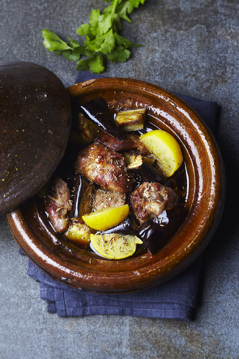 ②• Chauffer une cocotte ou un plat à tajine avec l’huile, colorer les morceaux d’agneau quelques minutes à feu vif, ajouter l’oignon, l’ail, les citrons confits, les aubergines et le cumin, mélanger, saler et poivrer, baisser le feu et ajouter le miel, laisser caraméliser, verser 1verre d’eau tiède, couvrir et cuire 1 h 20 à feu très doux.