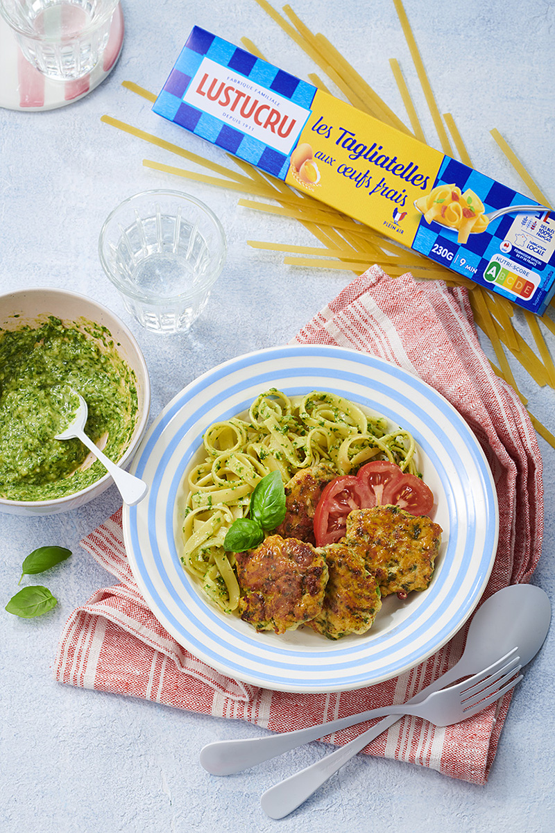 Tagliatelles au pesto de fanes de radis et croquettes de poulet