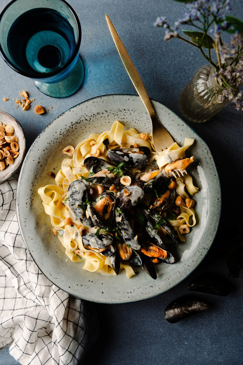 Tagliatelles aux moules sauce au bleu et noisettes torréfiées