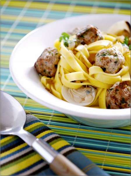 Égoutter les pâtes cuites al dente, les mélanger soigneusement aux billes dans la sauteuse pour qu’elles s’imprègnent de toutes les saveurs. Servir sans tarder.