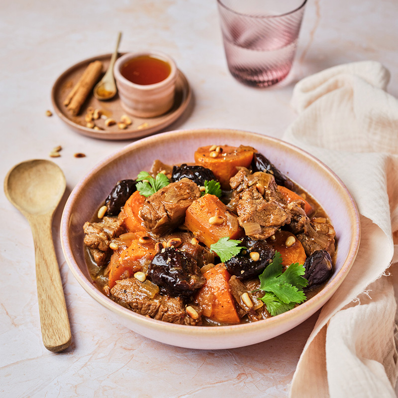 Tajine d’agneau aux pruneaux, patates douces et miel