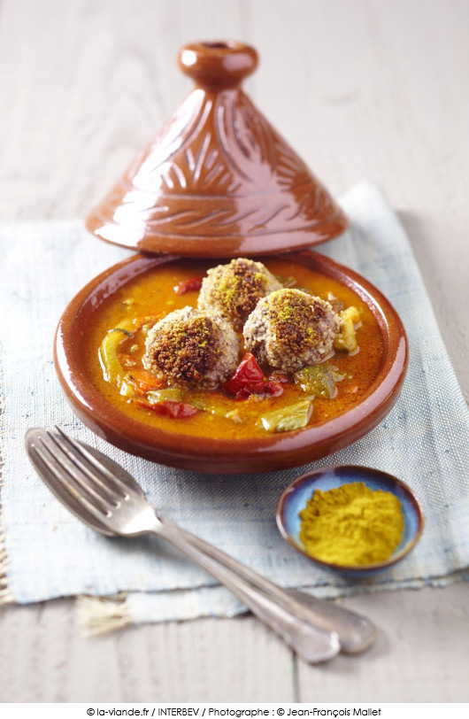 Servir le tajine de boulettes de bœuf aux poivrons accompagné d’une semoule.