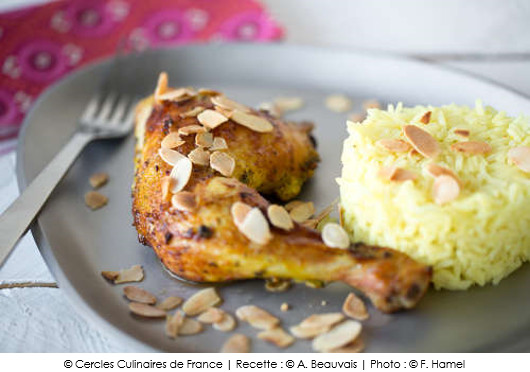 – Dresser les cuisses de poulet tandoori sur assiettes accompagnées du riz au ghee.