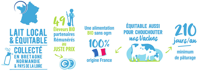 En 2021, la marque va encore plus loin, avec une charte d’élevage qui dépasse largement les exigences du cahier des charges de la production laitière bio. Cet engagement sur le long terme avec ces éleveurs passionnés est désormais certifié Commerce équitable par le label Biopartenaire®, qui garantit une juste rémunération des éleveurs sur plusieurs années et une valorisation de toute la filière.