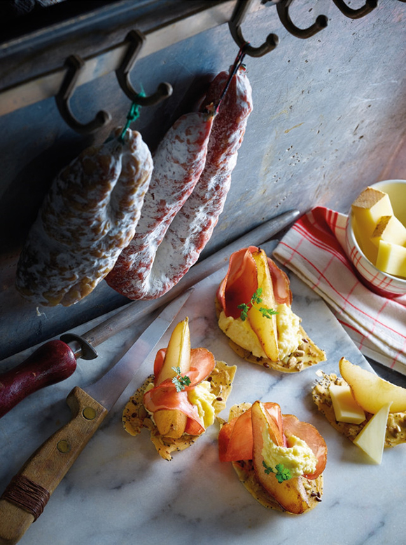 Tapas de poire rôtie sur cracker aux céréales, crème de Beaufort et viande séchée