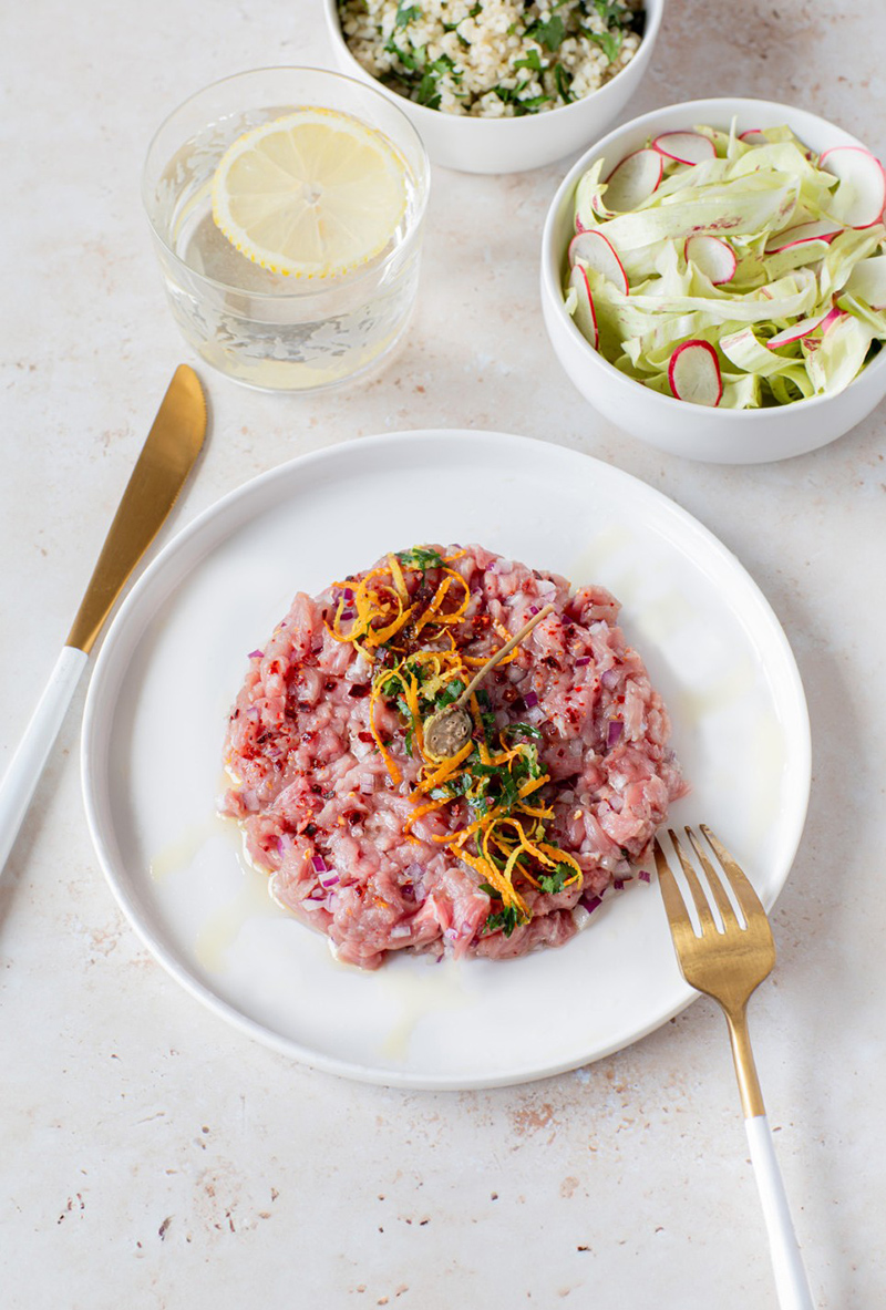 – La viande d’agneau se déguster crue traditionnellement dans les recettes du Moyen-Orient. Elle a une saveur fine et délicate. Relevée d’une gremolata, cet assaisonnement traditionnel de l’osso-buco à la milanaise, elle offre une recette savoureuse et tout en fraîcheur.