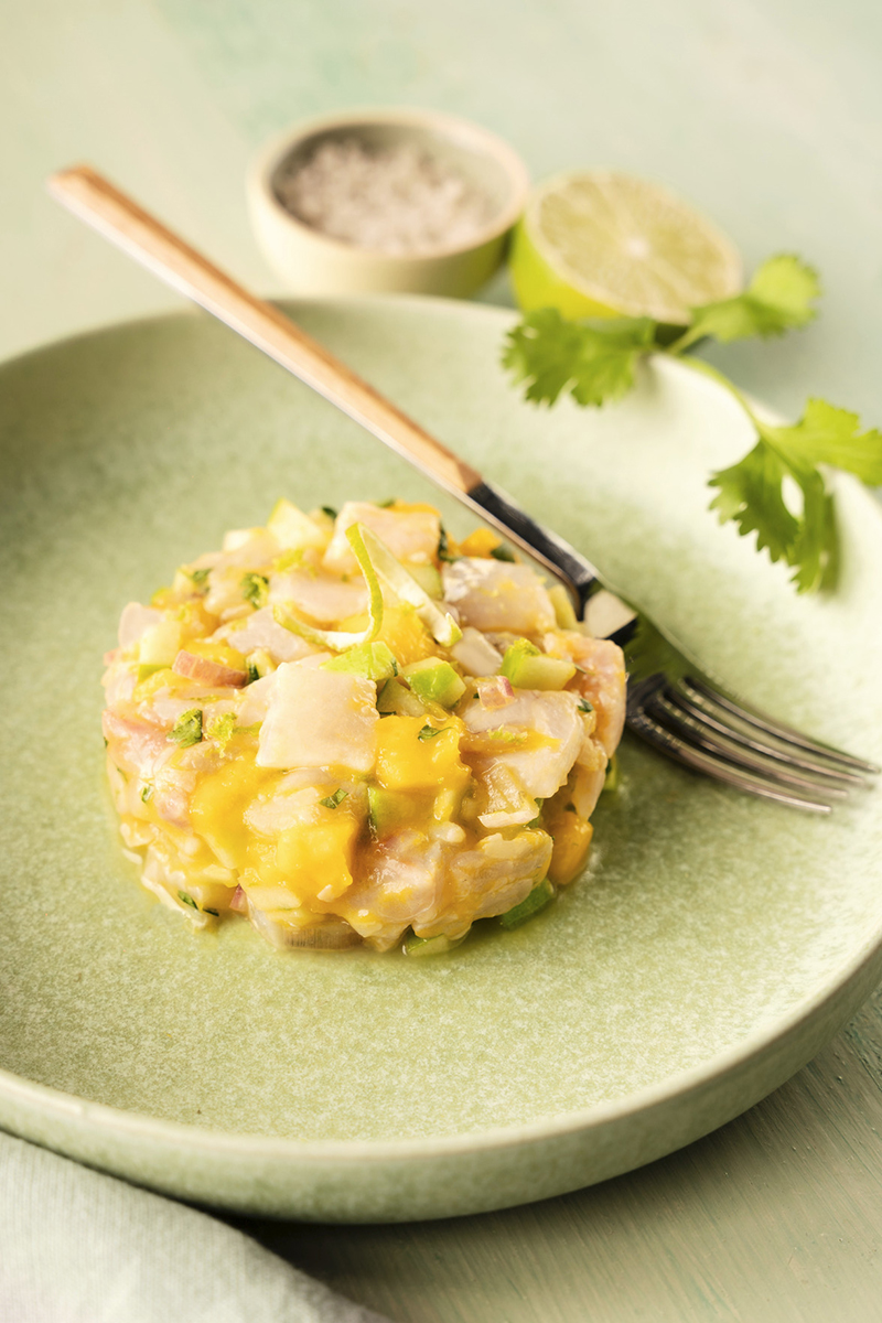 Tartare de bar à la mangue, pomme Granny Smith, coriandre, sauce citron vert