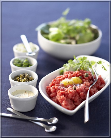 Servir le tartare accompagné de ses condiments et du mesclun.