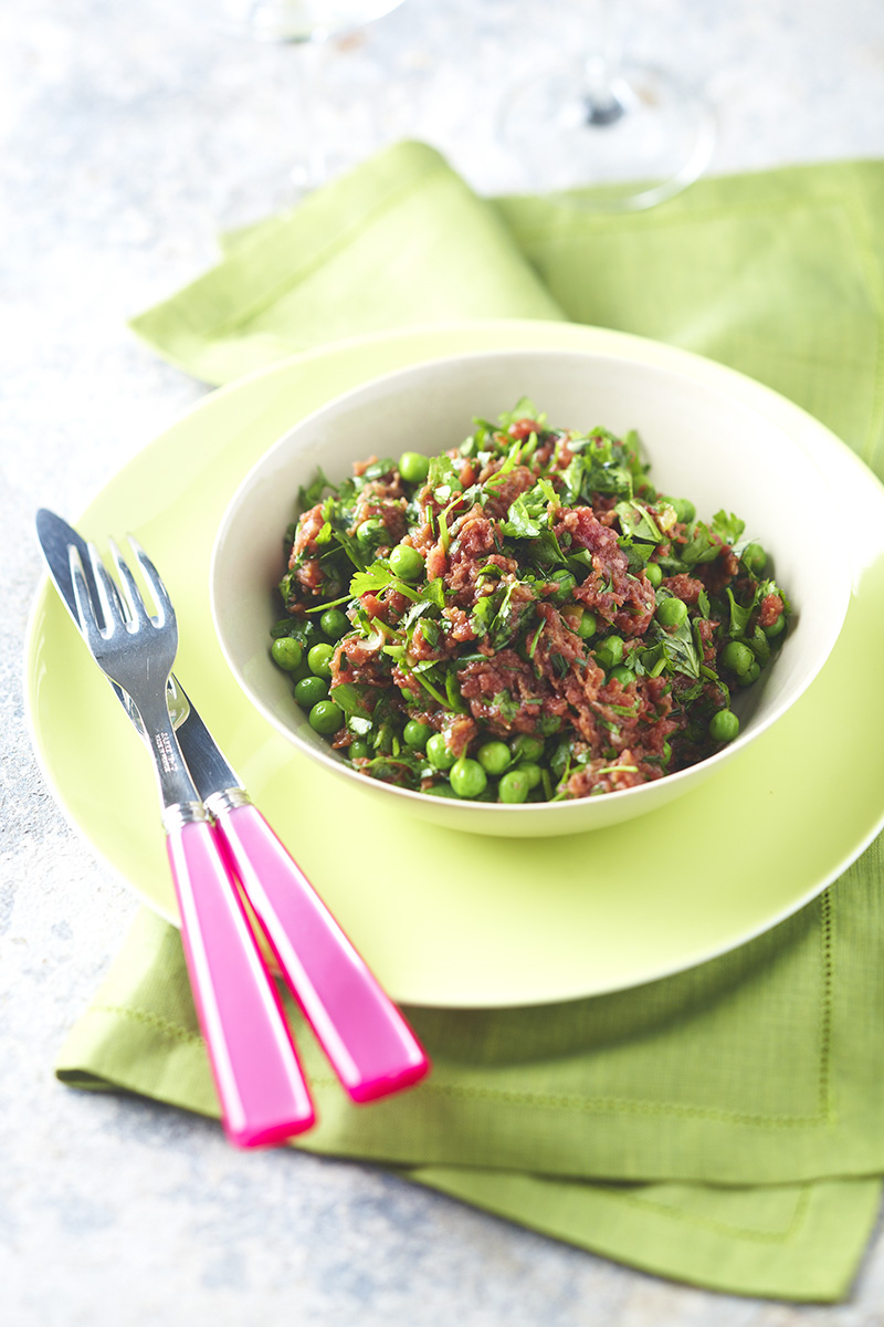 Il est possible de servir ce tartare de bœuf en chaud-froid : juste un aller-retour dans une poêle bien chaude et un filet d’huile d’olive.