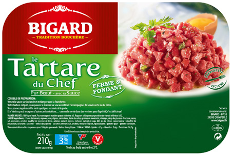 Bigard revisite un grand classique des brasseries : le steak tartare. L’idée originale de Bigard est de proposer un nouveau tartare, dit « au couteau », à l’instar des meilleurs restaurants. Grâce à sa maîtrise de la viande de haute qualité et aux moyens investis dans le développement de nouveaux processus de fabrication, Bigard a favorisé la mise au point d’une découpe de la viande en petits cubes, façon couteau. Le résultat est aussi étonnant que savoureux : les cubes apportent en bouche un fondant et un moelleux uniques, tout en restant plus fermes que la viande hachée. Cette nouvelle recette saura séduire l’amateur de tartare comme le novice, et cela, dès la première bouchée !