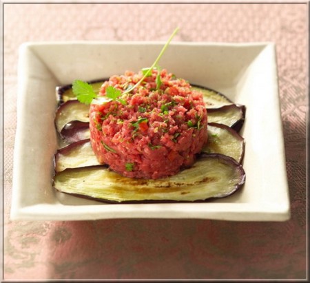 Remplir un ramequin de tartare. Le démouler harmonieusement sur les tranches d’aubergine.