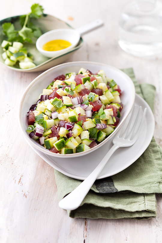 ③• Couper le thon en petits morceaux de la taille des cubes de courgette et de concombre.