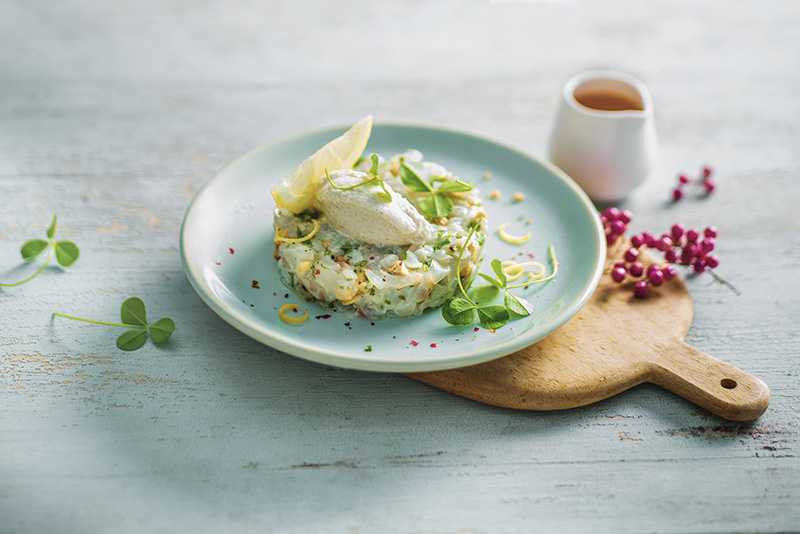 ⑤• Pour le poisson : tailler la daurade en brunoise. Mélanger avec les éclats de noix de cajou, la coriandre ciselée, le jus et le zeste de citron jaune, l’huile de noisette, le sel et le piment.