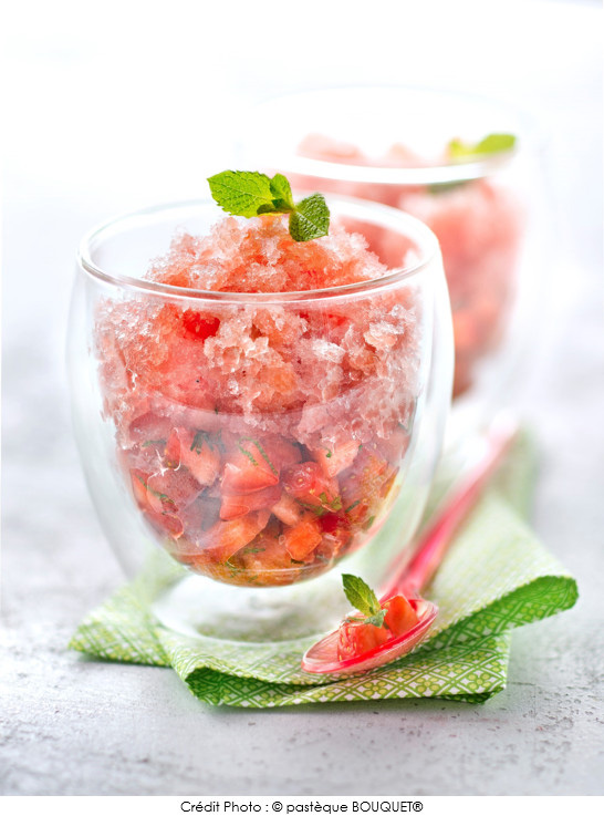 Répartissez le tartare de fraise dans 6 verrines. Ajoutez le granité de pastèque et servez immédiatement.