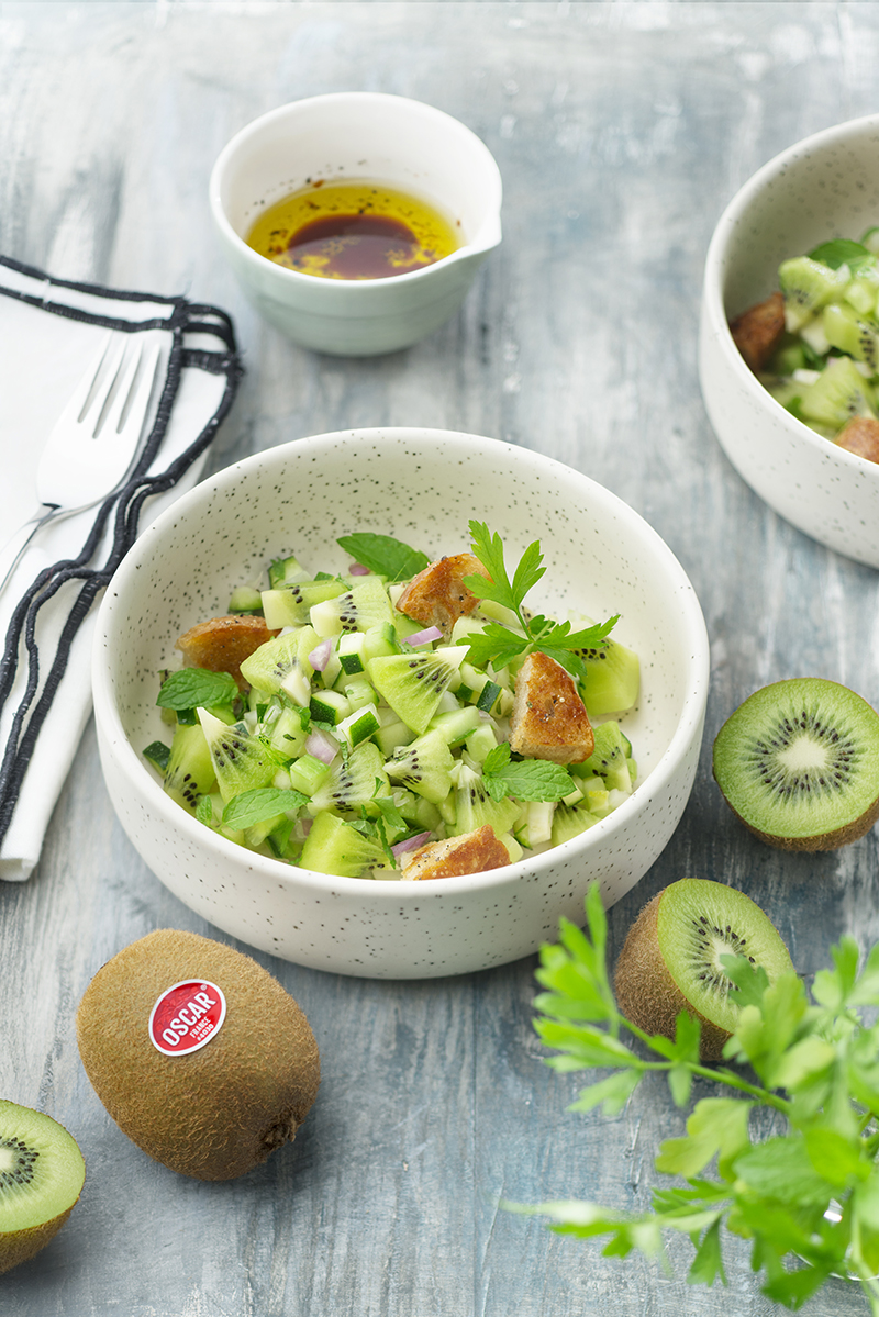 ③• Couper le concombre, les courgettes et le fenouil en brunoise. Peler les kiwis Oscar, ôter les parties dures et les couper en cubes.