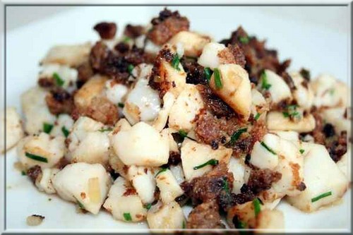 2.Prendre les coquilles Saint-Jacques et éliminer le corail s’il y a, laver-les soigneusement et les placer sur un papier absorbant. Les couper en petits dés et les réserver.