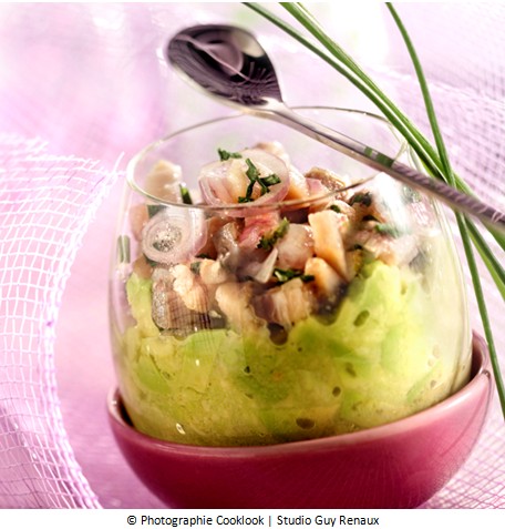5• Au moment de servir, mettre une couche d’écrasée d’avocats dans des verres, recouvrir avec une couche de sardines égouttées et décorer de brins de ciboulette.