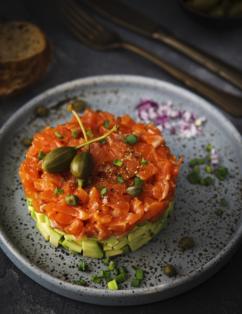 Tartare de saumon à l’avocat et aux caprons Bio au vinaigre Bravo Hugo