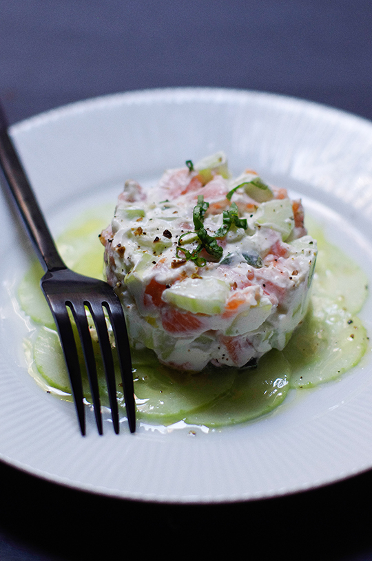 ⑥• Coupez le saumon en petits morceaux. Ajoutez à la crème, puis ajoutez ensuite les concombres coupés en dés.