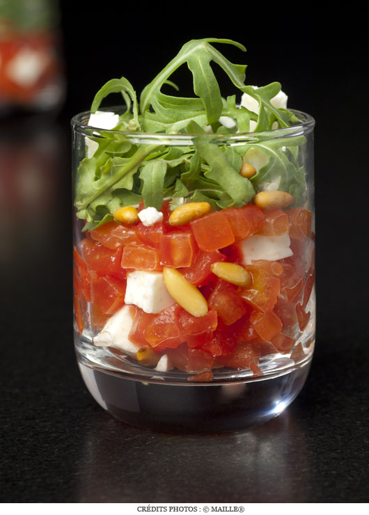 6•  Garnir les verrines de tomates à mi hauteur. Ajouter les dés de féta, puis la roquette et décorer de pignons.