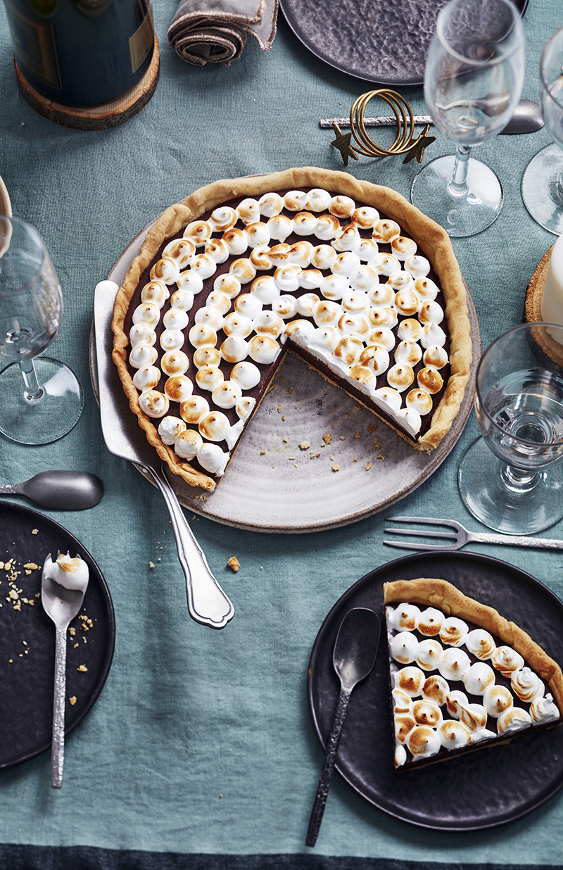 ≻ À l'aide d'une poche à douille, dresser des mini meringues sur toute la surface de la tarte au chocolat et les colorer rapidement à l’aide d’un chalumeau.