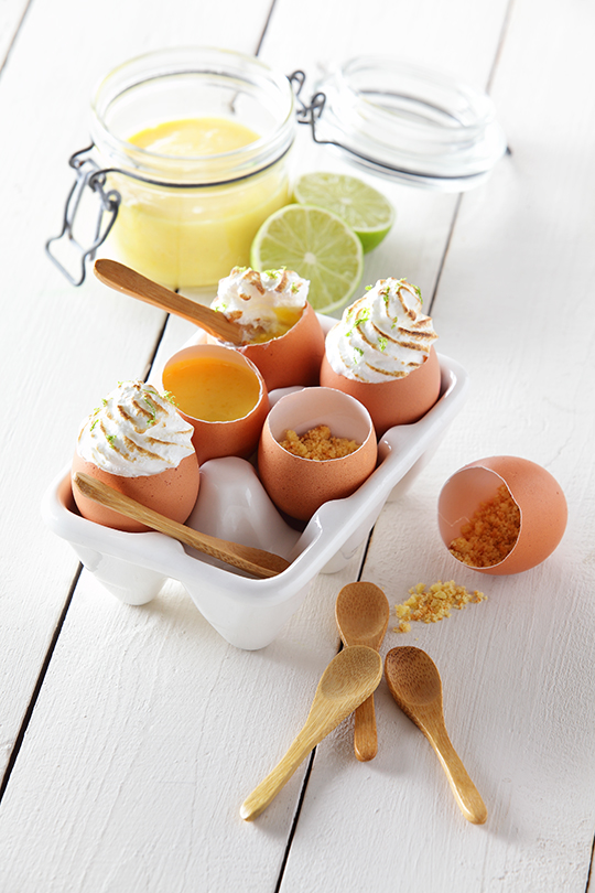 Colorez légèrement la meringue à l’aide d’un petit chalumeau de cuisine et terminez votre préparation en zestant un petit peu de citron vert au dessus de chaque œuf.