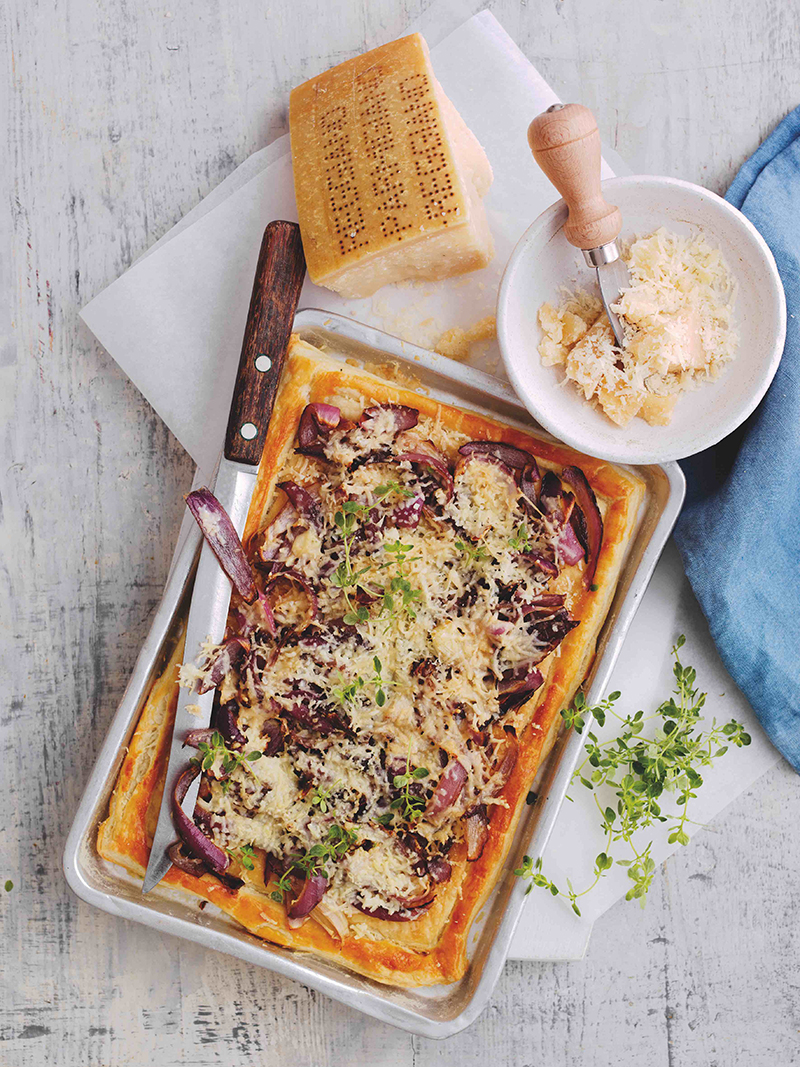Tarte au Parmigiano Reggiano, thym et oignons rouges