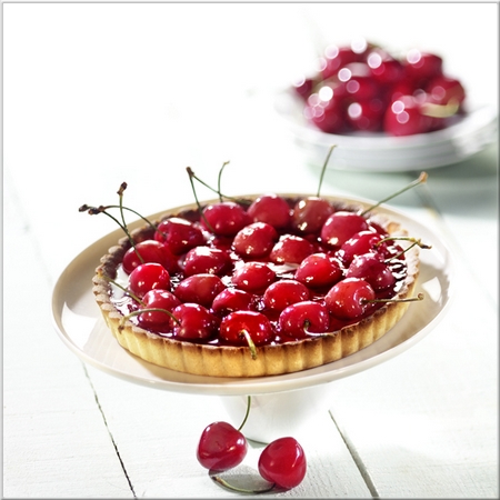 8• Ranger les cerises sur la crème en incluant quelques cerises crues avec leur queue au centre ou sur le pourtour et les napper avec la confiture de groseille liquéfiée au préalable au four micro-onde.
