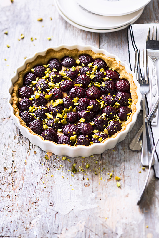 ⑦• Déposer la pâte dans un moule à tarte préalablement beurré et fariné. La piquer avec une fourchette pour éviter qu'elle gonfle à la cuisson. Répartir les cerises sur la pâte et enfourner pendant 25 à 30 minutes jusqu'à ce que la pâte soit bien dorée et les cerises cuites.