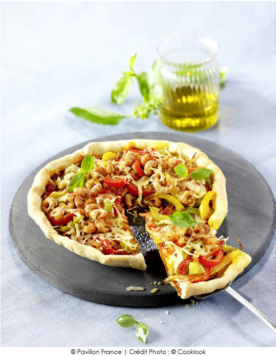⑤• Tartiner de confinade de tomates, disperser les poivrons, l’ail et les crevettes.