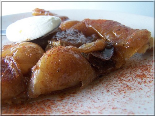 Cuire 20/25 min, en surveillant la prise de couleur de la pâte. Sortir le moule et laisser tiédir une dizaine de mn. Poser un plat de servir sur le moule, et retourner vivement. Saupoudrer la surface d’un peu de piment Espelette Servir aussitôt avec une salade bien relevée (n'ayant pas de verdure sous la main j'ai mis une cuillère de crème épaisse).