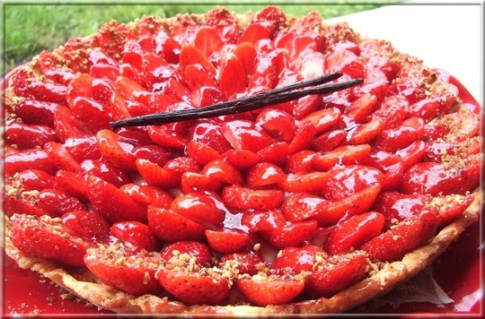 8.Montage : Etalez la crème pâtissière sur le fond de tarte refroidi, coupez les fraises en deux (ou en lamelles) et disposez-les sur la crème. Faites chauffer la confiture avec le jus de citron afin qu'elle se liquéfie puis nappez-en la tarte avec un pinceau. J'ai également saupoudrez les bords de pralin, ça apporte un petit côté croquant (pis aussi pour que ça fasse joli !)