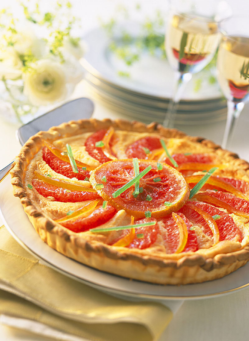 ⑩• Délester le fond de tarte des légumes secs et du papier sulfurisé, y verser la crème au pamplemousse, bien l’étaler et répartir les quartiers de pamplemousses, coupés en deux dans la largeur, à la surface de la crème.