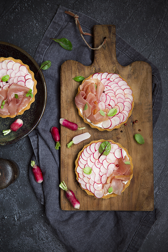 ④• Garnissez les fonds de tartes de fromage frais puis réalisez une rosace avec les rondelles de radis.