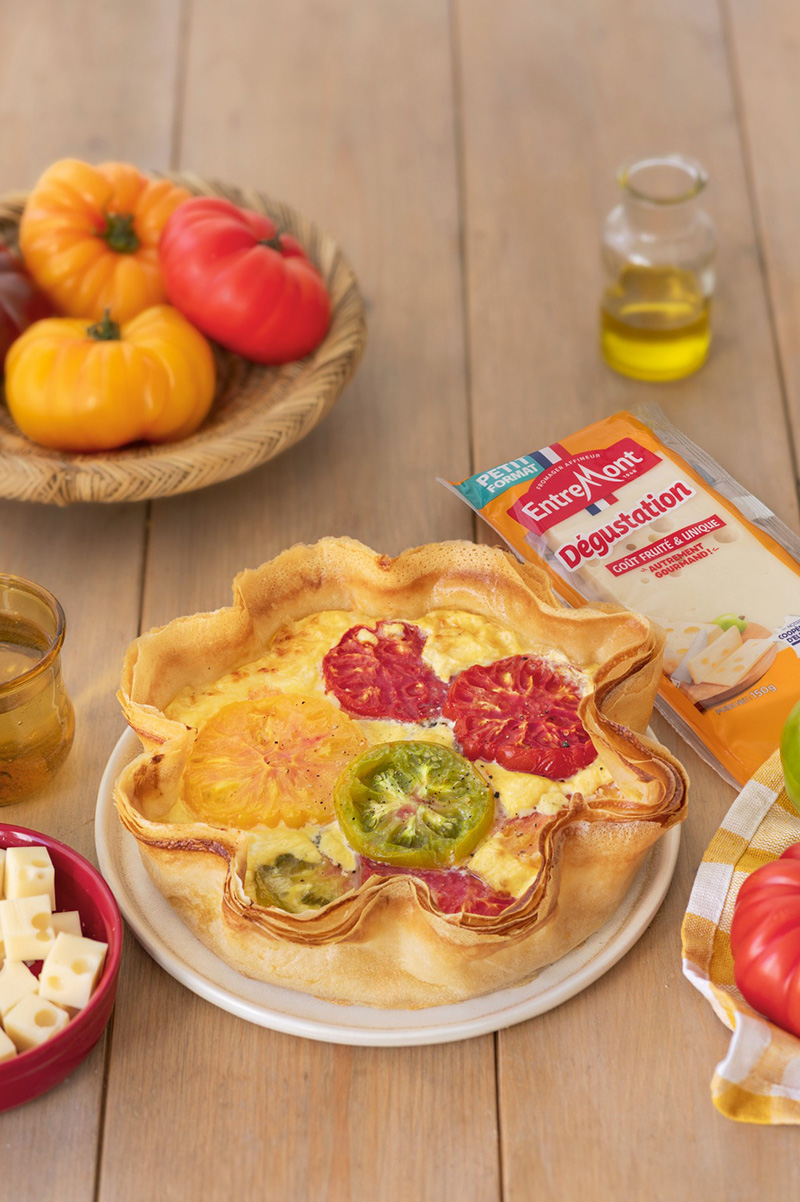 Une tarte croustillante aux feuilles de brick, sublimée par des tomates multicolores et un savoureux mélange de crème, œufs et fromage Dégustation Entremont. Un équilibre parfait entre fraîcheur et gourmandise.