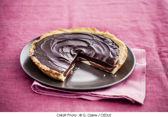 ⑥• Répartir le caramel sur le fond de pâte. Attendre qu’il fige un peu, puis verser la ganache par-dessus.