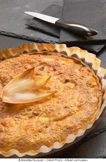 3• Ajouter les endives. Recouvrir avec le Maroilles Fauquet écroûté et coupé en dés, puis verser trois œufs battus avec 200 g de crème fleurette. Saler et poivrer généreusement.