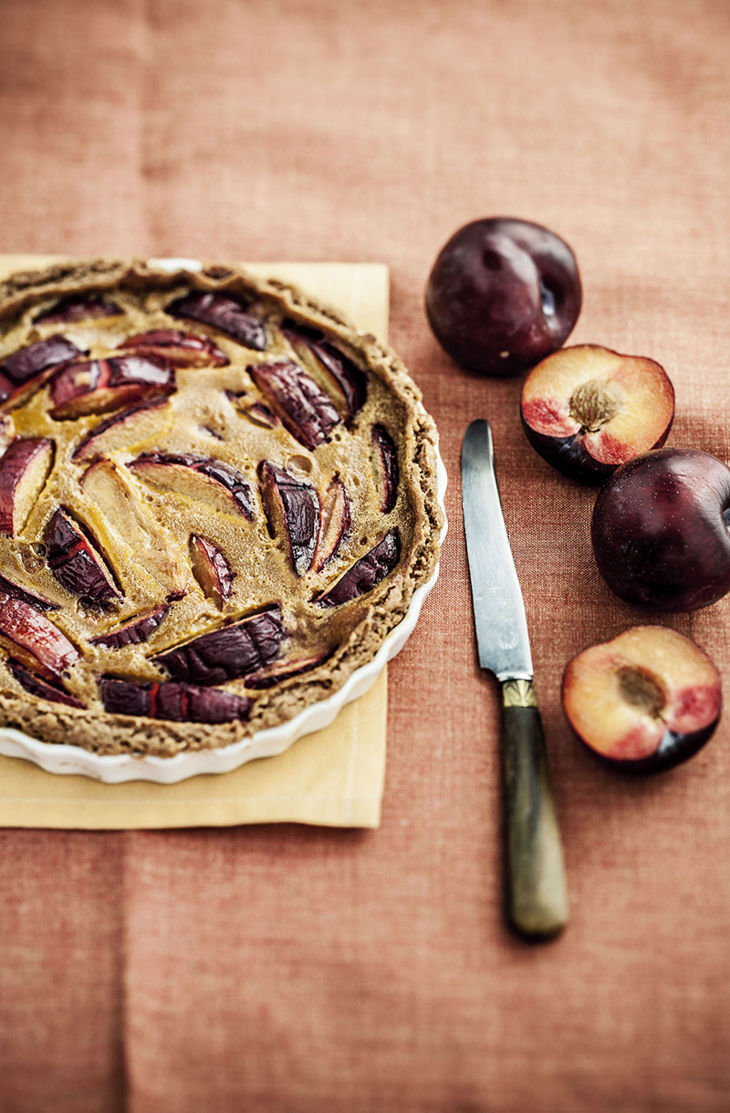 ④• Rincer les prunes, les couper en deux et retirer les noyaux. Dans un bol, fouetter ensemble les œufs, la crème et la vergeoise. Répartir les prunes sur la pâte et ajouter le mélange.