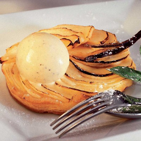 Servez tiède saupoudré de sucre glace et accompagnez d'une boule de glace à la vanille.