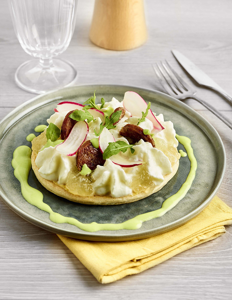 ⑦• Sur chaque tartelette, étaler un peu de moutarde, intercaler gelée d’andouillette et mousse au Chaource et surmonter de chips d’andouillette.