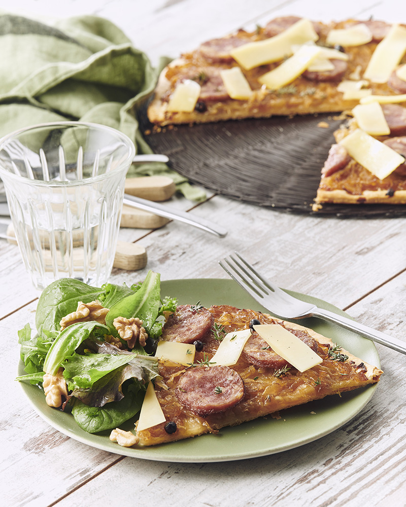 Tarte fine de Saucisse de Morteau, oignons confits, Comté et baies de genévrier