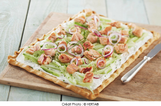 Tarte fine fromage frais, saumon, concombre & ciboulette