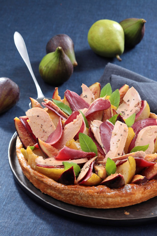 Tarte merveilleuse, poires, magret fumé et foie gras