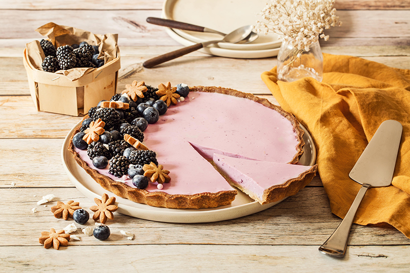 Décorez la tarte avec les mûres, les myrtilles, les petits sablés et la meringue coupée en morceaux.