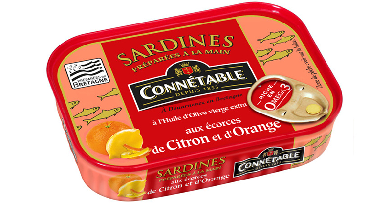 Rencontre inédite entre le bleu des mers de l’ouest et les tons chauds des agrumes du sud, Connétable fait voyager nos papilles vers de nouvelles contrées gourmandes. Toujours préparées à la main et plongées dans l’huile d’olive qui leur va si bien, les sardines Connétable sont accompagnées de fins rubans d’écorces de citron et d’orange semi-confits pour un accord délicatement sucré-salé aussi audacieux que délicieux. Laissez-vous surprendre par ce mariage innovant de saveurs fines, où les papilles oscillent entre les notes iodées et la touche fruitée. Une recette originale (et vite addictive !) qui renouvelle les repas sur le pouce et donne du pimpant à nos créations estivales.