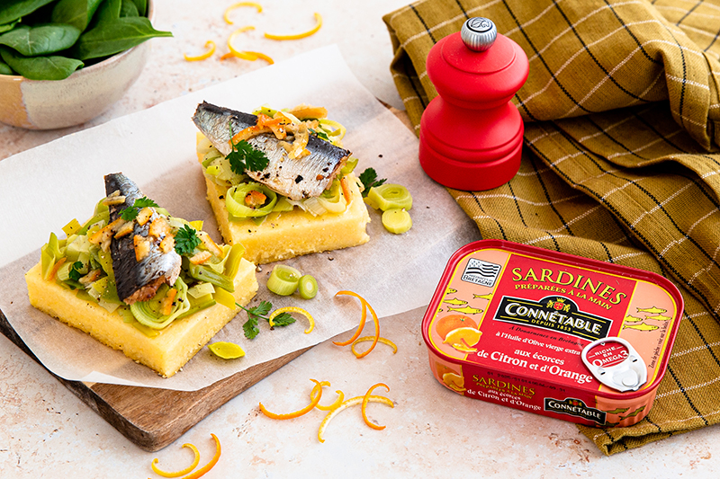 Tarte polenta à la fondue de poireaux, sardines aux écorces d’orange et de citron Connétable
